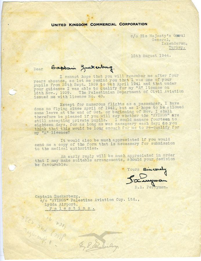 מכתב מ- ר.א פרימן, איסקנדרון, טורקיה, אל קפטן עמנואל צוקרברג - חידוש רישיון טיסה מדרגה A