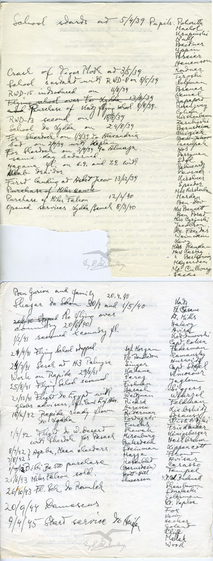 רשימה בכתב ידו של עמנואל צור המפרטת בסדר כרונולוגי טיסות ואירועים חשובים שהתרחשו במסגרת פעילות בית הספר לטיסה של חברת אוירון, בין 5.4.1939 ל 9.4.1945. לצידה רשימה שמית של 106 בוגרי בית הספר לטיסה.