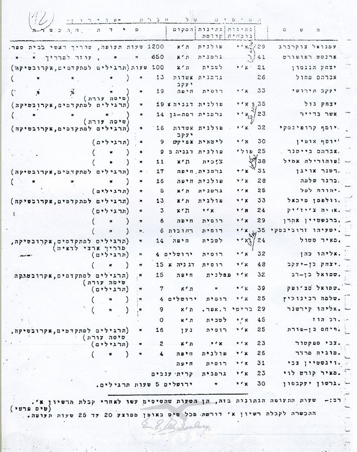 רשימה מודפסת עם פרטי הטייסים של חברת 'אוירון'