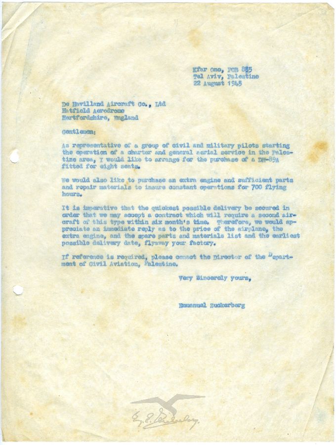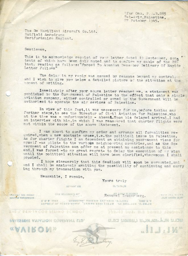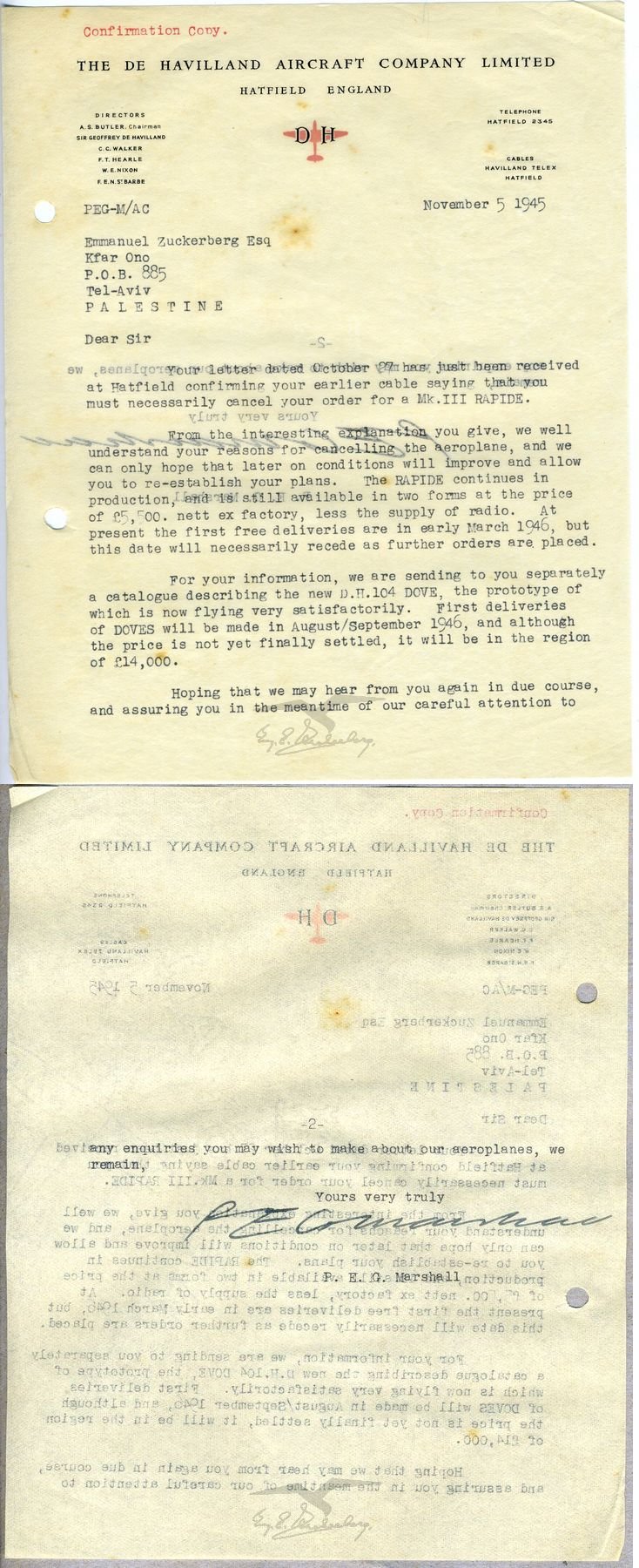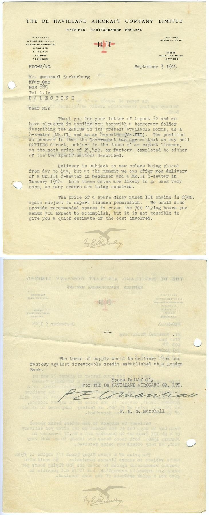 מתוך רצף של חמישה מכתבים - תכתובת בין חברת יצרני המטוסים דה-האווילנד מאנגליה לעמנואל צור מחברת 'אוירון', בנוגע לרכישת מטוס נוסעים מסוג רפיד (DH-89A) וציוד נלווה (מנוע וחלקי חילוף). העסקה לא יצאה אל הפועל בשל הגבלות שהציבה ממשלת פלשתינה על חברות תעופה שאינן בשליטתה ובשל מצב פוליטי לא יציב במזרח התיכון.