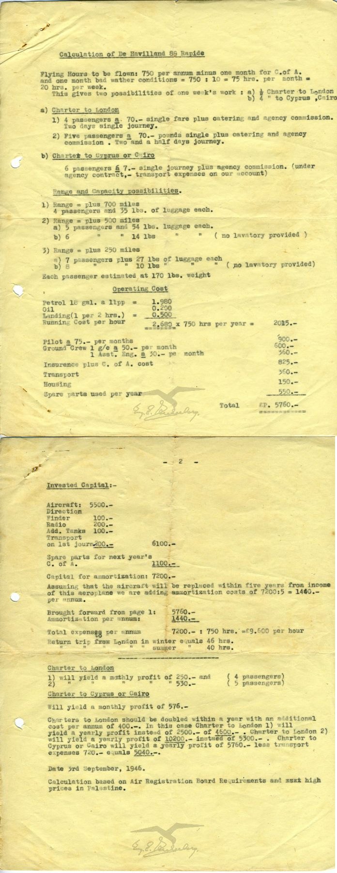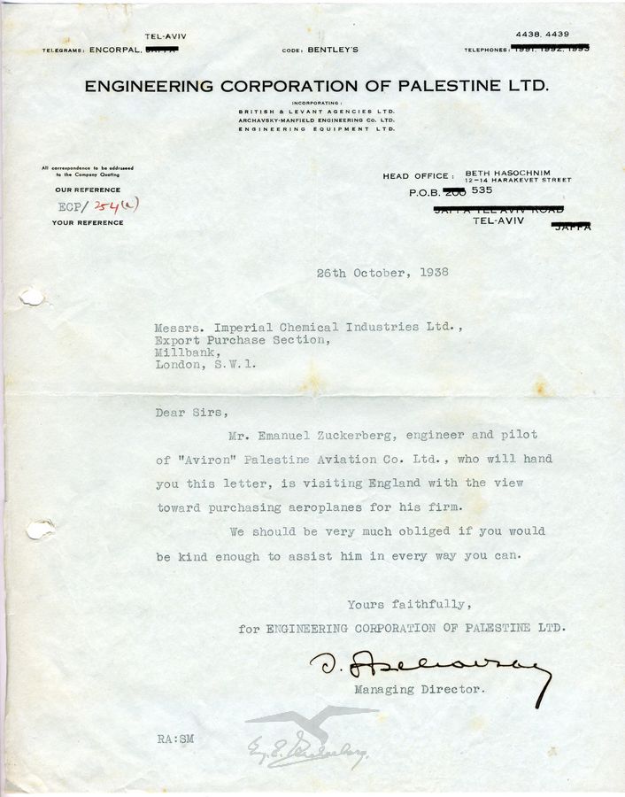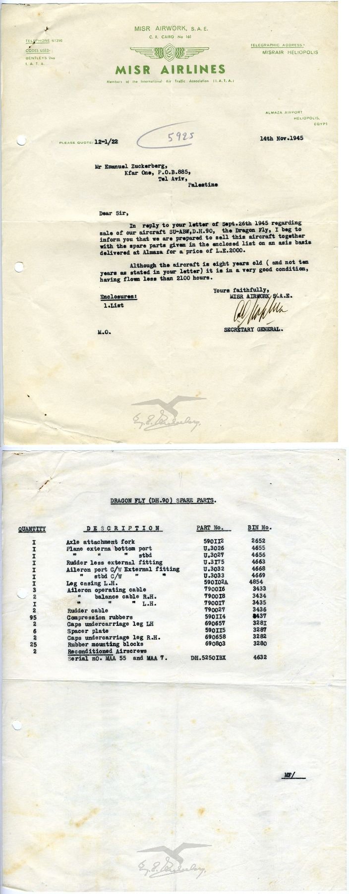 מתוך רצף של חמישה מכתבים - תכתובת בין חברת יצרני המטוסים דה-האווילנד מאנגליה לעמנואל צור מחברת 'אוירון', בנוגע לרכישת מטוס נוסעים מסוג רפיד (DH-89A) וציוד נלווה (מנוע וחלקי חילוף). העסקה לא יצאה אל הפועל בשל הגבלות שהציבה ממשלת פלשתינה על חברות תעופה שאינן בשליטתה ובשל מצב פוליטי לא יציב במזרח התיכון.